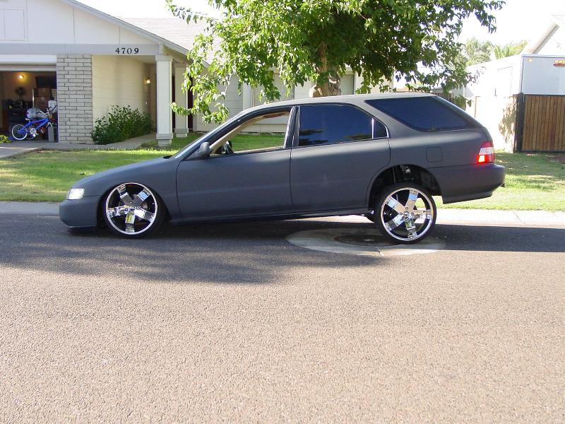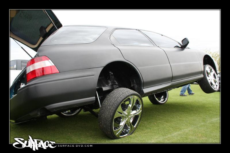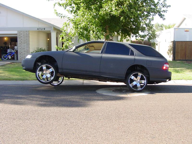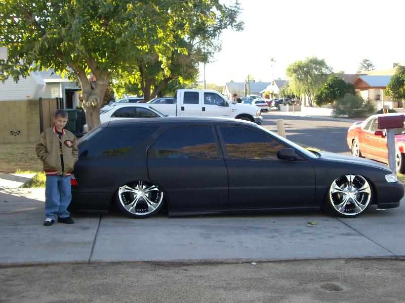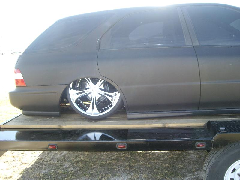 Black Satin primer,Shaved Everything but gas door, shaved door handles, hatch,hatch sqirter, antenna, side moldings, squirters, emblems, bumper body lines, marker lights on front bumper,1 piece crome projection head lights. upper Trendz billet grill, Trenz billet lower, Stainless Steel Elipital Elliptical tube licence plate bracket that I made, dark ass tint! just got a rear bumper step made out of polished billet from the interior shop.