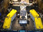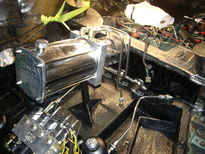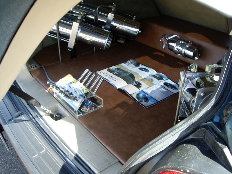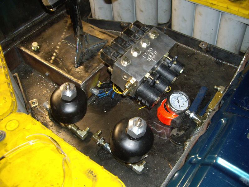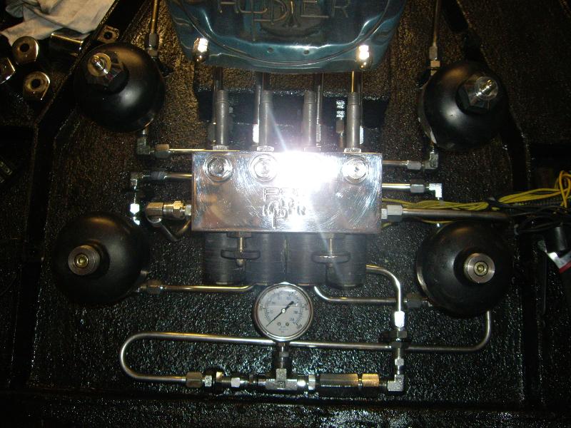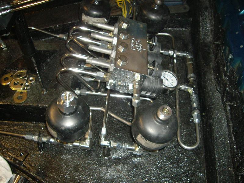 1 pump 8 dump pro hopper manifold, 8's in the Front, 12's in the Back with powerballs, 2 link rear arms made out of 1 3/4inch .250 wall DOM with 7/8 heims, 1/2 inch plate rear cradle Accumulators for a smooth ride, Parker fittings, Hardlined, 4 Optima D31A yellow top Batteries sunken in the the spare tire holder, Polished DC front strut bar, rear is tubed for 22's