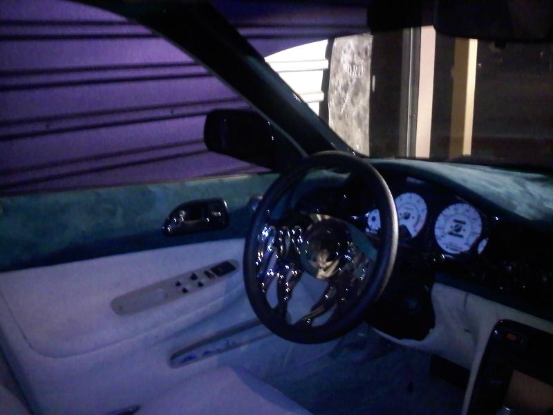 green suede with tan tweed.Chrome FLame billet steering wheel, painted pillars and other random plastic inside everything else is suede or old school tweed..