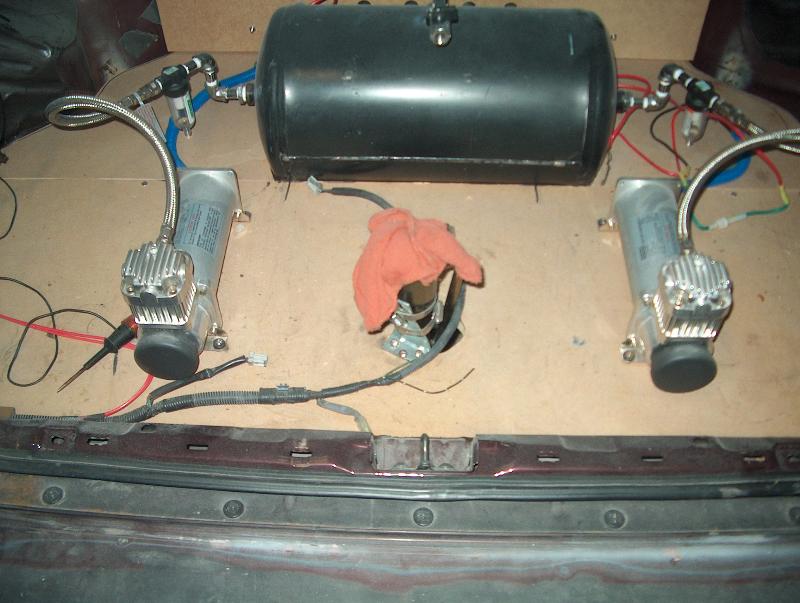 E.A.I. AIR CYLINDERS, 8 1/2 IN DANZ VALVES, 1/2 IN HYDROLIC LINE, 8 PORT 1/2 IN 5 GAL TANK, 2 VIAIR 450 AIR COMPRESSORS