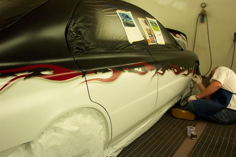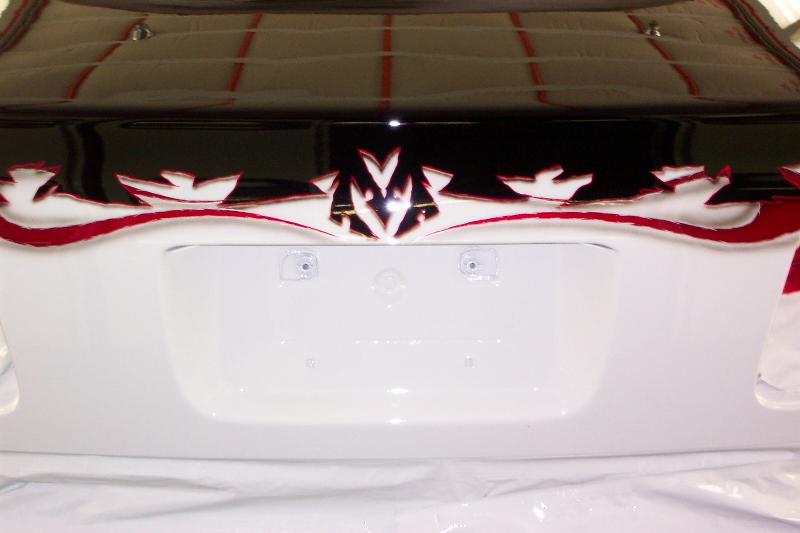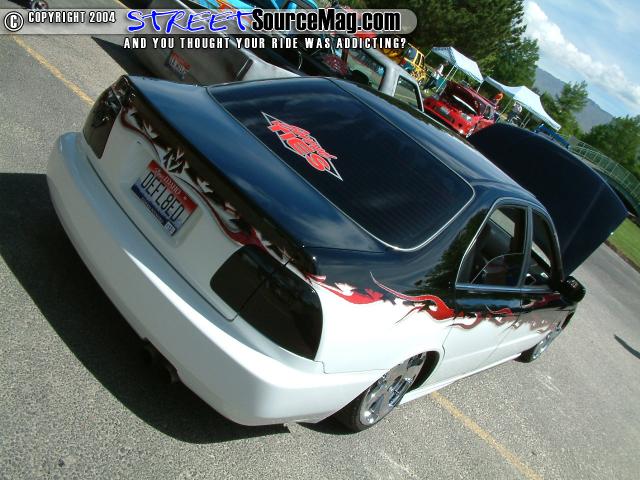 PPG Vibrance Crystal Black Top, Candy Apple Red Flames,Frost white Bottom, Blacked out lights all around, Trenz Billet Polished Upper/Lower Billet Grills, JDM Black-housing headlights, B/Clearcoat color matched (front-lip, side skirts, rear lower lip, Limo tint.