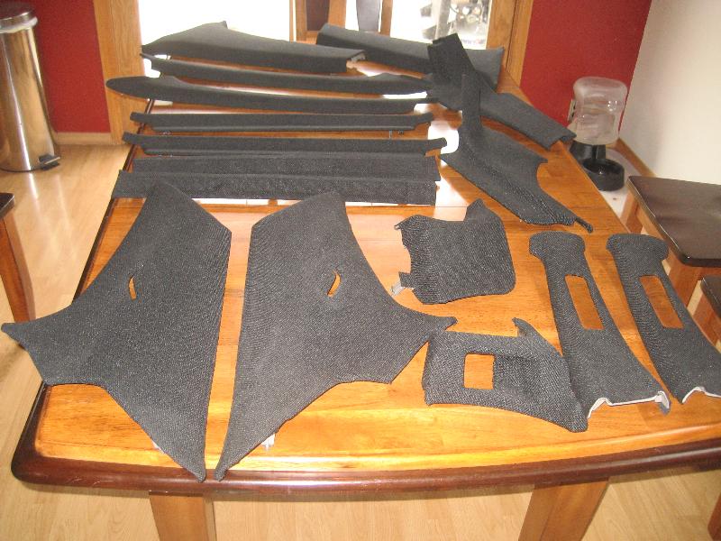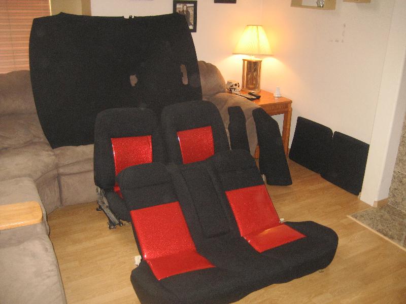 36 smoothed and painted color matched Frost white plastic pieces, Fiberglass glove box, Black leather shift boot/ E-brake, chrome shift knob, chrone E-Brake handle, Billet cigarette lighter. Black Tweed door panels, red glitter vinyl inserts! Lots of sparkly red and black...