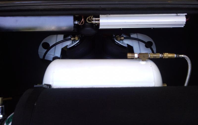 SMC Heavy-Duty Cylinders in front & 4 Parker 1/2" High flow valves and (4) 3/8" GC valves, tubbed out the rear and new bag set up with canilever and 2600.lb. bags with drop shocks from an s-10 and tubbed the front.
