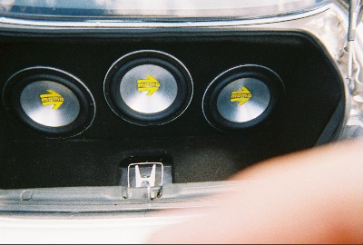 HAHAHAHA, 3 "12" MOMO'S COSTOM BUILT IN THE TRUNK WITH A MEMPHIS 1100 WATT AMP,INTERIORS ALL MOMO'S 5 1/4 IN TH DOORS AND COSTOM ON THE ACK DECK WITH ALL TWEETERS, alpine tv, head unit, 2 tv,s in the sunvisiors...