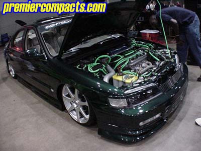 2.2L 4Cyl SOHC Vtec, AEM Intake, DC Sport Header, Greddy Catback SP Exhaust, ACT Street Organic Clutch, AEM Underdrive Pulley Kit, Aem Ajustable Cam Gear, Polished Valve Cover, Triple Chrome Plated 150 Amp Alternator, Hose Techniques Neon Green Show Kit, Various STR Polished Accessories, Steel Braided Hose Kit, Strobes, Green Neon, Optima Yellow Top Battery, we'll leave it at that.