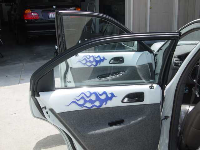 tweeded doors, headliner, dash and pillars all done by pirate customz and air brushed flames on door panels done by Air Creations trenz iron cross rear view mirror