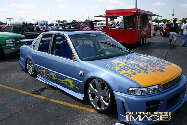 The body have every thing shaved like door handles, gas filler door, hood squirters,shved plate holes in bumper, power antenna hole, mirrors,tail lights, and shaved an frenched license plate box,bmw z-4 tail light conversion,led brake light.Custom made hood humps to cover bags. Apr aluminum dtm style wing painted and chromed with one off flamed ends ,