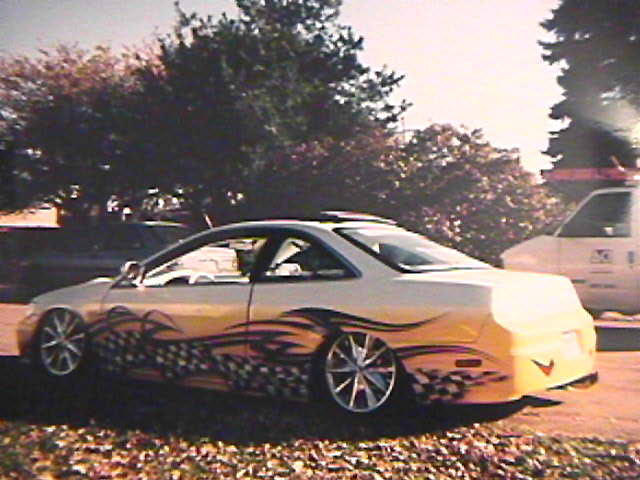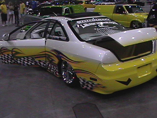 shaved doors,suicide doors,tilt hood, custom bubbles in hood where the bags are..bags on upper control arms,gas door,tail lights, custom lights in bumper.yellow fading into pearl white/w graphics