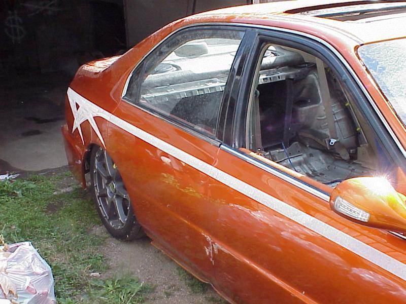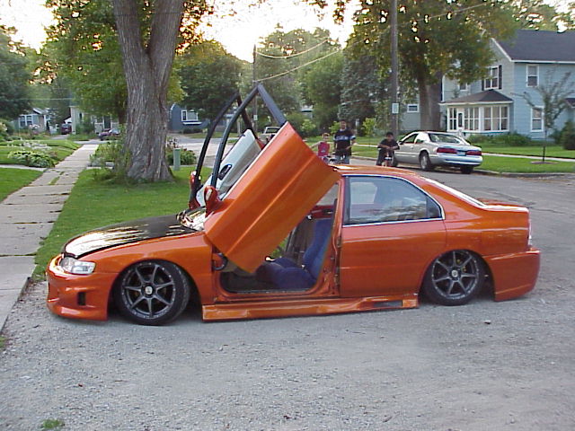 :showoff3 front bumper,blackwidow side skirts,buddy club rear bumper shaved door handles,shaved emblems,frenched lisence plate, candy orange paint,spoiler, carbon fiber hood, lamborghini doors