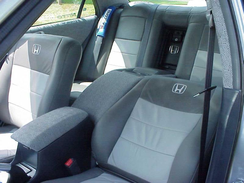smoothed interior pieces painted same color as car ,chrome shift and brake handles,chrome accord door sills,2 power acoustic visor tv's,playstation 2,weapon-r pedals,brushed aluminum gauge bezel,weapon-r billet seat handles,diamond plate floor mats,hypnotic swirl interior,10.4" Concept flip down,full fiberglass console in rear seat covered in hypnotic swirls,full cutom two-tone leather seats w/ logos stitched in,trunk completely built in and trunk lid plate covered in hypnotic swirl,buzztronics inc led kit throughout interior and trunk(fully sponsored),7 color black series gauges and gauge bezel sponsored by Glow Shift Gauges, blk jdm headlights w/ 8000k hid kit.
