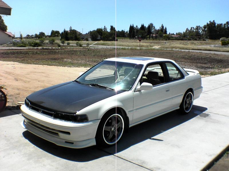custom front lip, carbon fiber hood, 93 front end, custom red & clear tails, 1 piece projector headlamps, and it's painted integra type R championship white