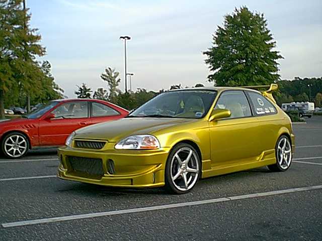 wings west tuner series kit, shaved door handles, molding, back wiper, antenna, emblems, wiper squirters. side skirts molded in so there are no screws. paint is ppg kandy sunshine yellow on a silver base. commando wing with altezza taillights