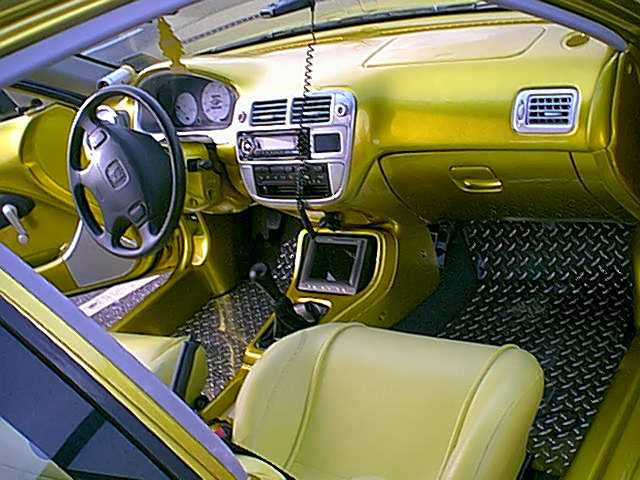 2 yellow obx racing seats, tv, playstation 2, diamond plate floormats, indiglo guages, 5" autometer tach flush mounted in dash, cd player, all interior parts are painted same color as the car, ignited push button start