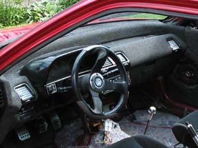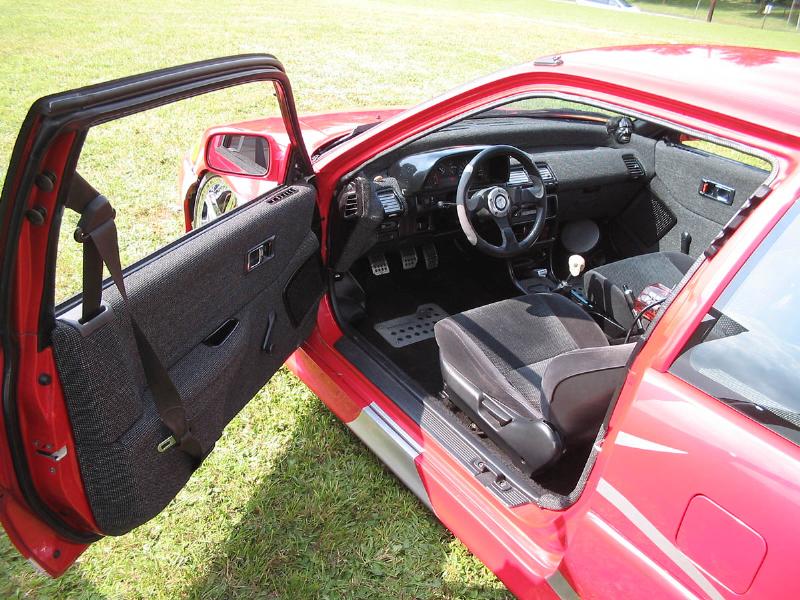 tweeded everything with dark and light gray, integra ls seats and center console with armrest, ichibahn pedals and floor plates, flamed tweed roof liner, billet shift knob and a monkey skull shift knob, custom rear half made to hold soundsystem and air ride components, hand pinstripped gauge cluster hood and rear hatch cover, billet moon eyes maltese cross mirror with shrunken head, raised "666" dice on rear cover behind seats
