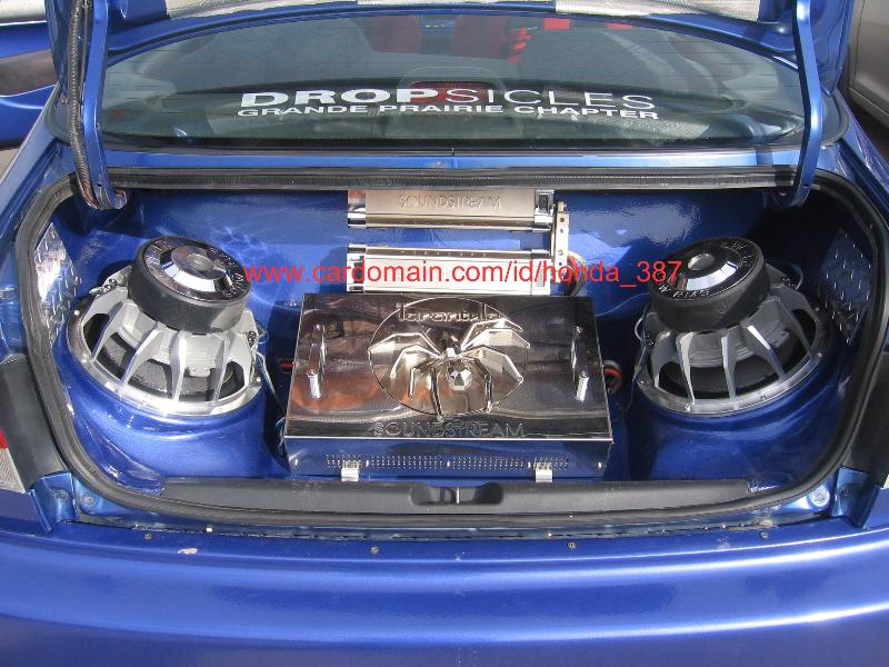 -Pioneer DEH P8400MP deck -Soundstrem TR880/2 Tarantula amp -Audiobahn AWT10X sub -Soundstream SC4 4 farad capacitor -Custom fiberglass enclosure