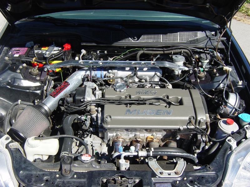 B16,ported and polished head, mugen valve cover, dc strut bar, oil cap, battery tie down, and intake, obx header, hks dragger exhaust