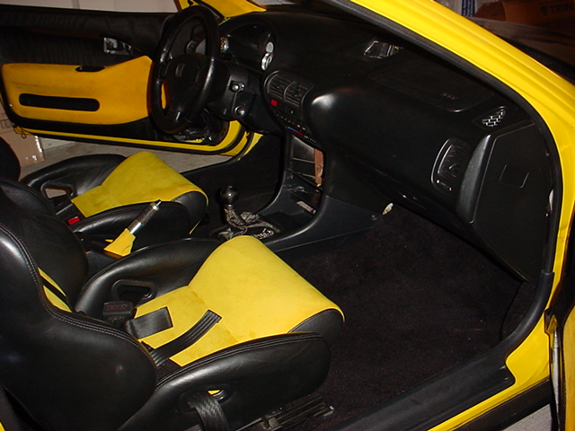Leather Trim Ltd. custom interior consisting of Jamex racing buckets covered in black leather and yellow suede w/matching door skins and rear seats.Headliner and pillars have also been covered in the yellow suede.Custom black carpet and floor mats,trimmed in yellow suede.Custom Carbon Fiber shift boot.Integra GS-R dash w/Carbon Fiber dash kit,and instrument cluster.JDM Civic SiR Steering Wheel.Carbon Shiftknob. MOMO Pedals. Complete Aerokits Carbon Fiber Door Panel Inserts, and Dash mount guage pod. Carbon Rear Cargo Cover. New custom Carbon Fiber Door Skins. Autopower Roll Cage.