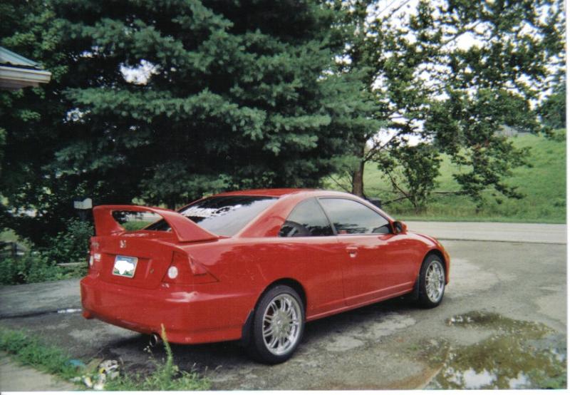 red..stock..red light washer nozzles..17' chrome Milanni Ambrosia rims..chrome euro taillights..15% black tint on windshield, 15% black tint on both side windows and 20 % on back window...catback exhaust..red painted brake calipers and brake drums..spoiler