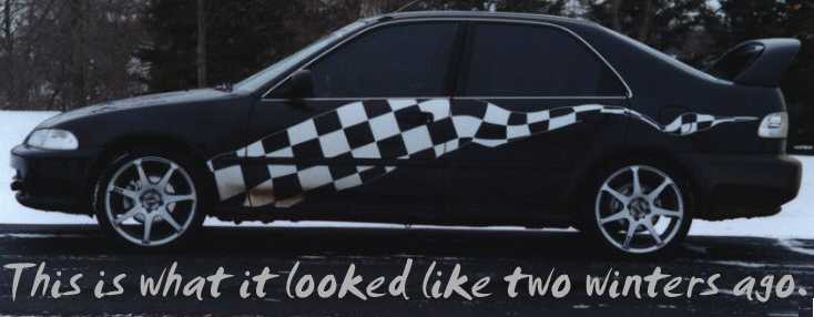 IS300 tail light conversion, halo projector head lights, Lamar window tint 32% i have the tint tickets to prove the darkness. :) Z3 fenders, First Gen Black Widow Hood, M3 mirrors with lights in the postes, shaved door handles and door moldings, shaved key hole for trunk, shaved radio entena, and Eclipse gas tank lid mod