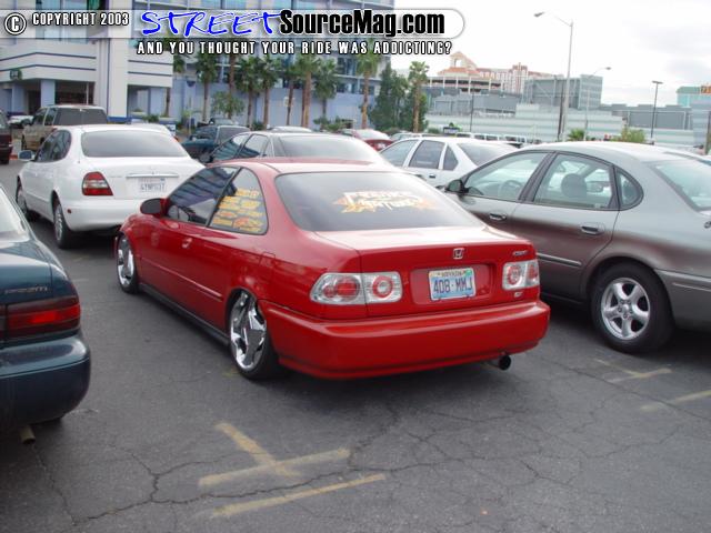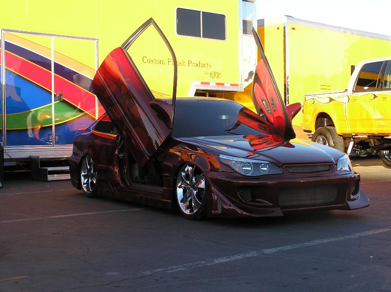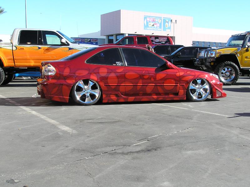 DuPont Hot Hues Sinful Cinnamon and DuPont Hot Hues Crimson Splash, Shaved door handles, hood squirters, antenna, emblems and plate box, Paint and body done at Ten Ten Custom Paint (702-614-9040), 2004 BMW 5 Series Headlights, Lexus RX 330 Taillights, VIS Battle Z front bumper, VIS TSC side skirts, VIS TSC Rear Bumper, conversion done at Auto Explosion in Gardena L.A. (310-329-6691), Decah door kit(3-15-03) and a billet lisence plate holder from F.B.I.