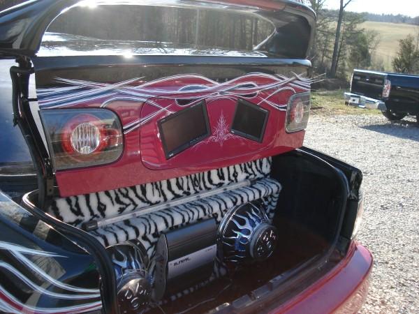 custom paint, tvs in trunk lid, 17 in chrome wheels, custom speaker setup, pin striping, exhaust, full body kit