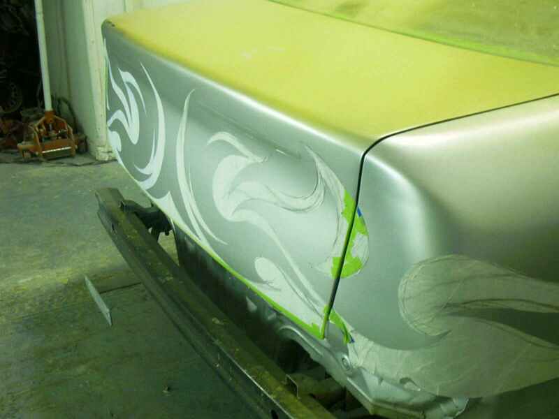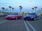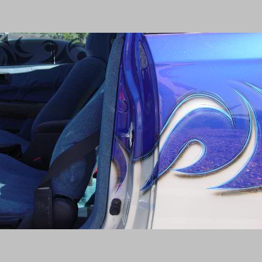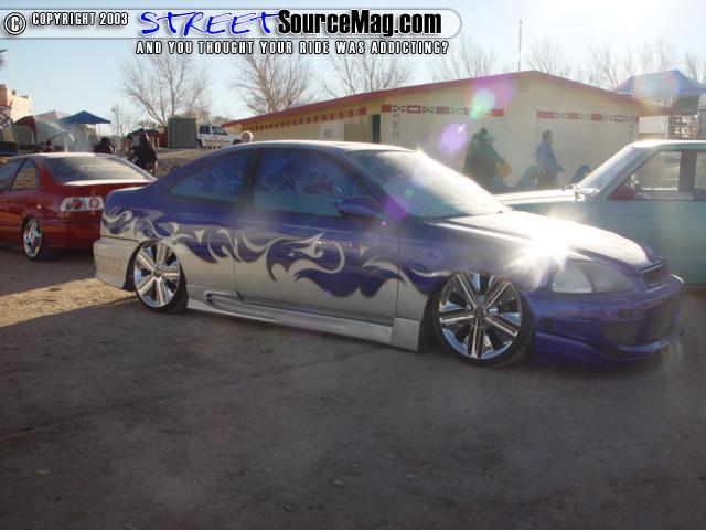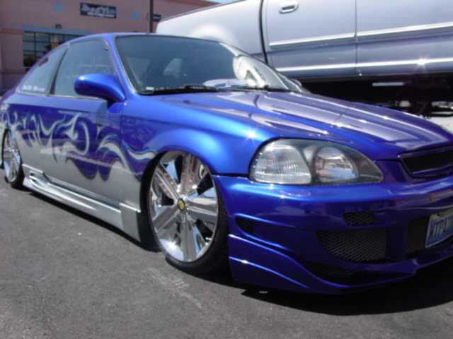 The Top half is HOK Makic Blue Pearl. and the bottom is a HOK Silver metalic something. All highlighted and shadowed through the Jams and Striped tribal style in Baby Blue. All so, shaved everything but the gas door. 2- 12" by 1/4" Hi-tech LED's for brakes. Body kit, JDM front lights. etc. All painting and Finish work Done By TENTEN CUSTOM PAINT of Las vegas
