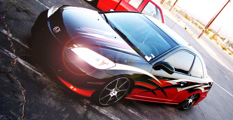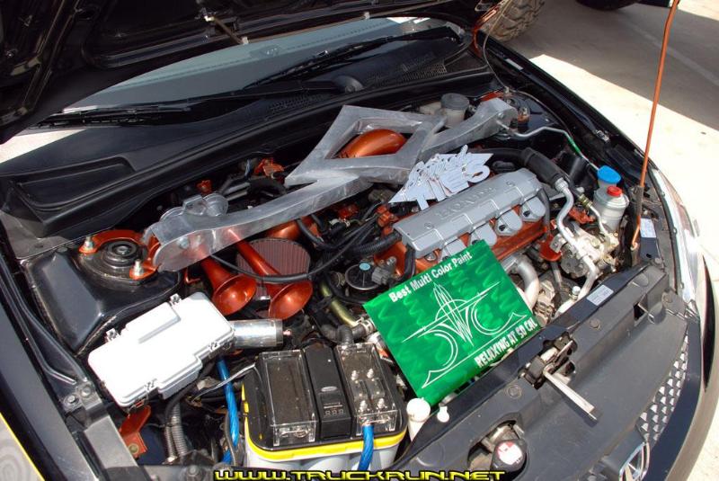 SOHC Hiyami modified intake and Hand fabricated aluminum strut bar with raised DIAMOND wrapped around intake, DC header, magna flow cat, resinator,and exhaust.Air horns. Powder coated copper to match rockstar juiced can