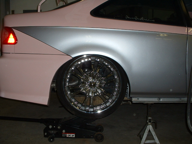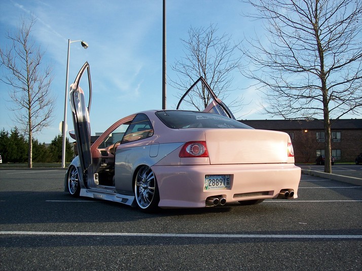 full body kit .. bullet fenders .. m3 mirrors .. duel halo projector headlights .. different tail lights ... custom painted carbon fiber hood ... duel exhaust .. shaved door handles ... shaved side moldings ... shaved trunk ... tag relocated on drivers side in rear bumper ... shaved ant. ... two tone paint job which is baby pink and sliver w-a black pin stripe which flows from the outside to the inside