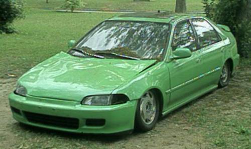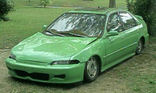 Ghetto Green with blue metal flake pearl crap, civic coupe front bumper, some photoshopped mods to hood, front bumper, and mirrors, custom jumped on dents in hood