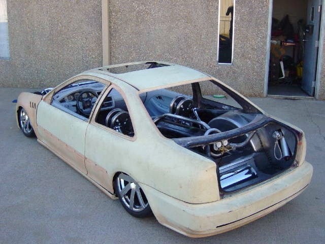 full custom air suspension inside of rear of car,sheet metal floor and tubs.