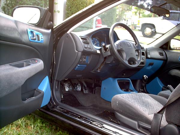 Blue panels, 2 12'' woofers with a 1000 watt amp, eurolite gauges, carbin fiber pedals and shifter