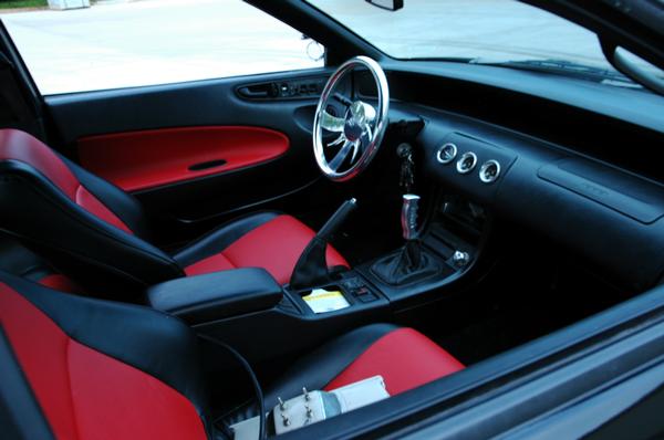 Red and black Leather, Bad Steering Wheel, Viair black face gauges in dash, 63 caddy switch box.