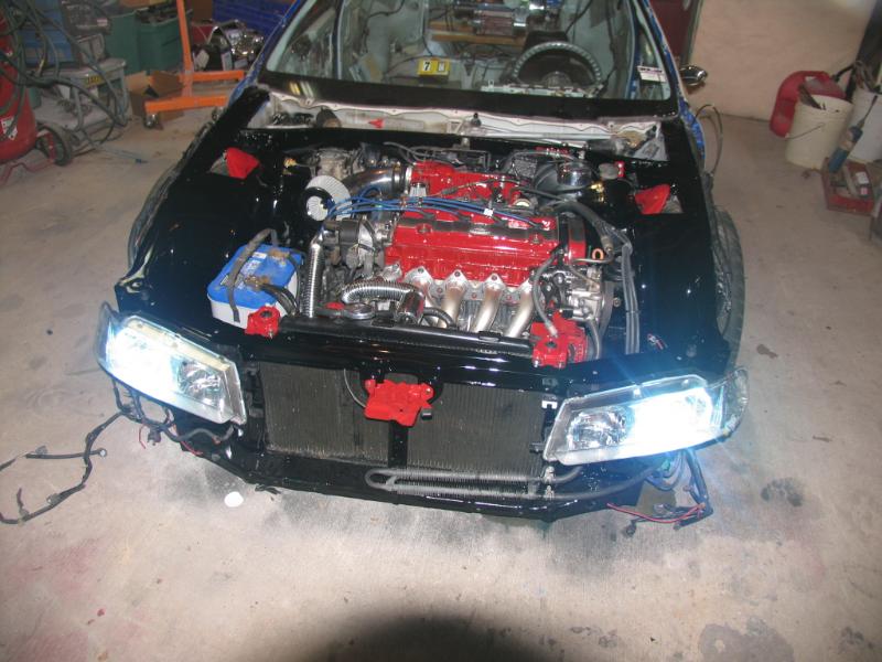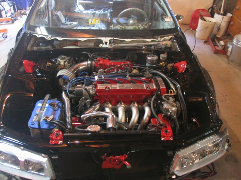 2.3 polished, chromed, and painted, bolt on bs, cams, clutch, computer, head and intake port matched. Shaved fire wall, aprons, and core support. Relocated all the wiring under the dash to clean up engine bay.