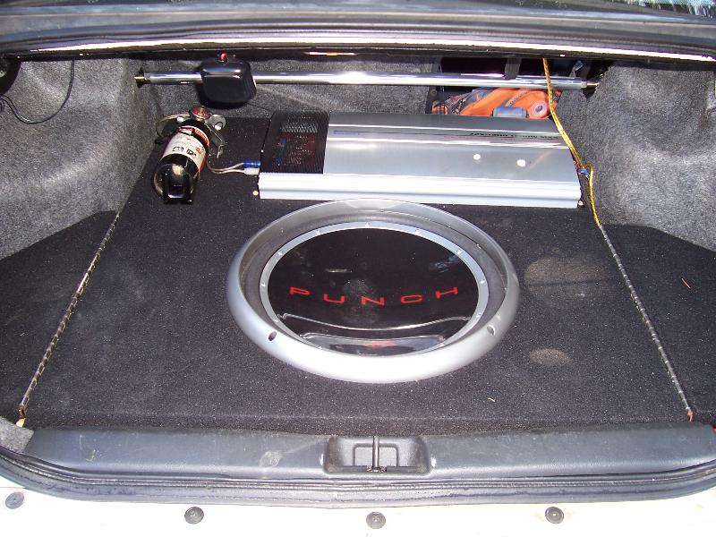 XM, Sony CD player, Sony 500/4ch amp, 2 Sony 5 1/4" speakers in back dash, 1200/1ch SPL amp, Punch 15"