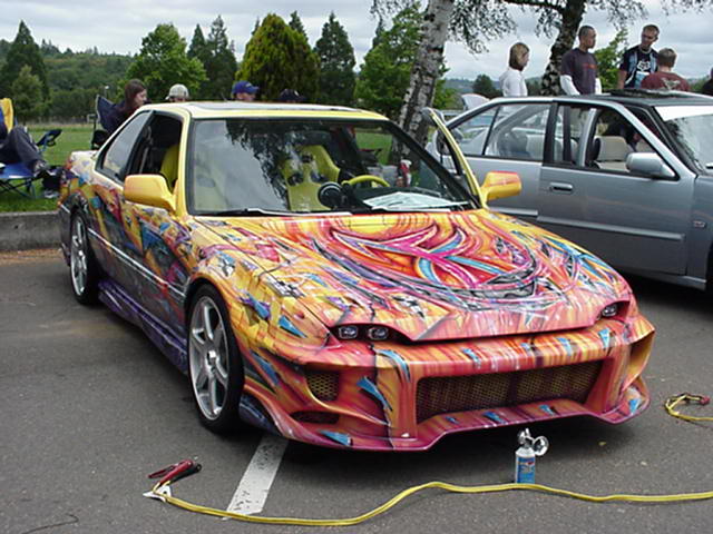 molded front bumper, shaved emblems, shaved antenna, custom hood, custom headlights, full graphics paint job