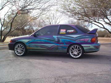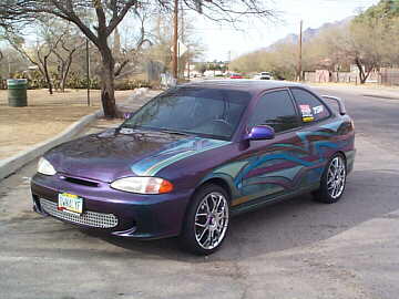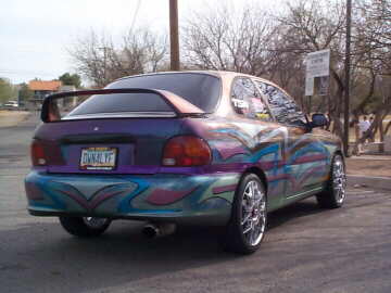 17 color tribal chameleon and candies paint job. Shaved handles, remote door pops, shaved emblems, shaved antenna, frenched antenna in rear fender, supra wing, blue side turn signal lights