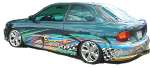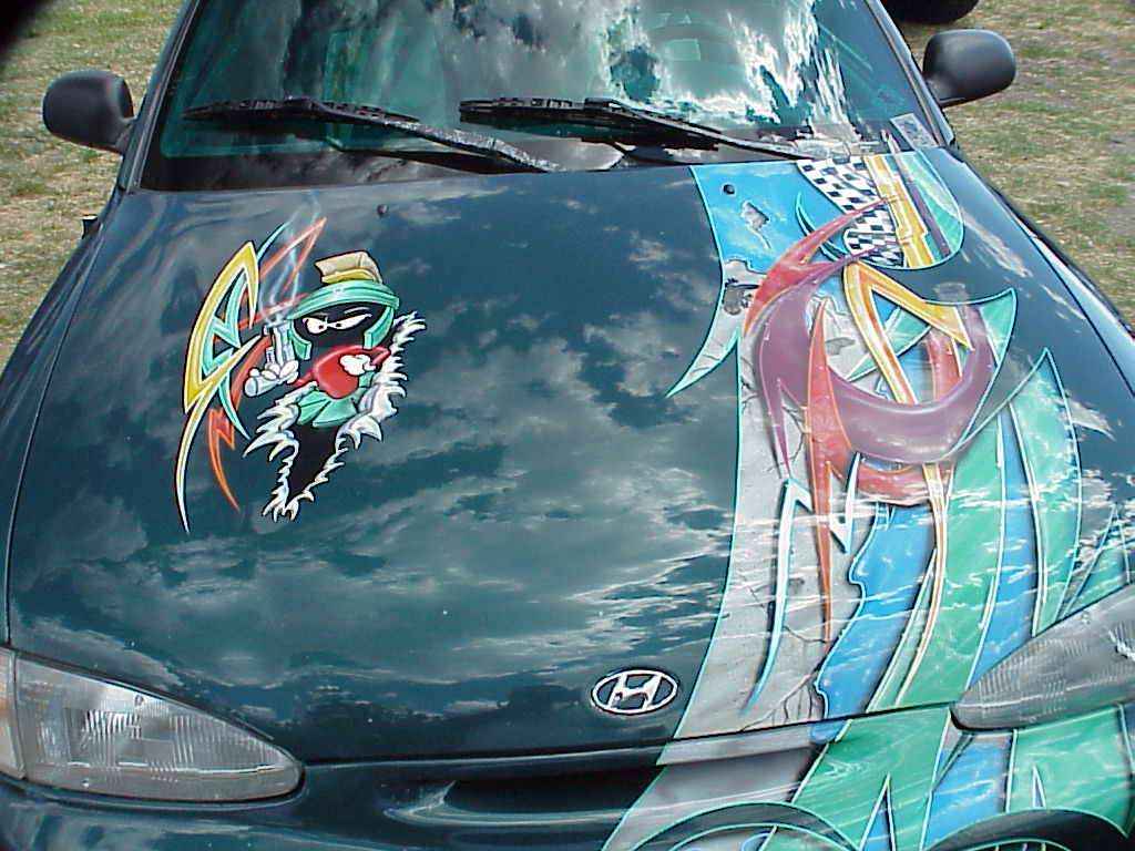 shaved handles ,moldings emblems,green tinted glass, metalic green paint w/blue pearl full west coast graphics done by al's pinstriping