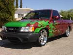 Shaved tail gate handle, shaved factory roll pan, billet l-plate frame, painted mirrors, billet ant., painted cowl,euro tail lights,2000 Hombre front clip, Flames in H.O.K. lime time pearl, Striping done by Jim Gear, Painted by Photo Finish, Billet grill