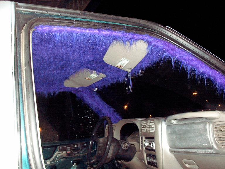 purple shag, billet, grey stock upholstery.
