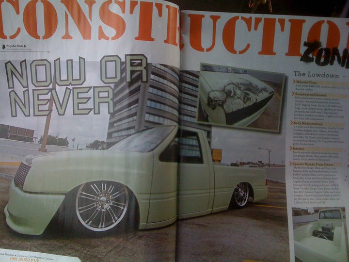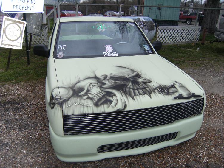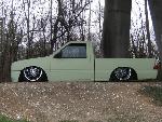 HOK Mint Green,shaved handles,mirrors,gas door,hood pissers,emblems,corners,bed seams.Rodeo door panels,Aussie Tails,Grant combo & license box,Sectioned/Smoothed & molded 4x4 Yota bumper/valence,Sheetmetal bed floor & wheels tubs,RCI 15 Gal. Fuelcell