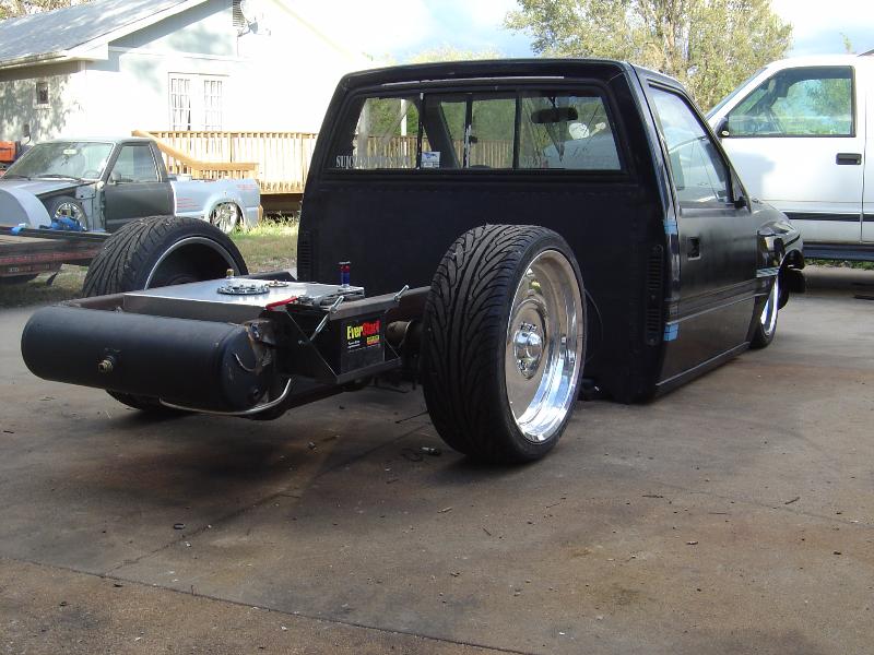 s-10 front clip with cut lowers, 2600 bags all the way around, 6 SMC 3/8 valves and 2 1/2 inch, custom 2x3 frame, 2 link rear with diagonal link, narrowed 10 bolt with POSI.