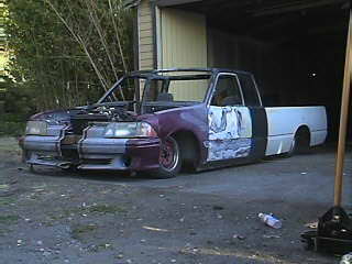 x-tended cab longbed, custom made 1987-93 Ford Mustang GT Front end, 87 mustang mirrors, Shaved door handles, custom smooth rollpan, custom shaved tailgate, custom fenders, cut off the "space cab" part of the roof, cut the truck in half & WIDENED it 13 1/4"s, primered. Plans include shaved fuel filler, clear tailights, custom made cowl induction hood, new roof, removable hard top, & few other small things and other I want to keep on the down low.