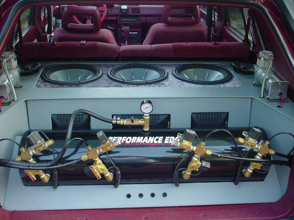3/8's fast bag kit, 8 SMC valves,1/2 inch line, Viair compressors, 12 gallon tank, Slam Specialty bags and a Scuba tank regulated between 150-160 PSI with Stage 1 regulator