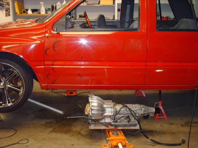 2.6 ltr 4 cyl w/ a 4spd AUTOMATIC TRANSMISSION. Modded Honda Civic intake and a yellow top. A lot of relocated crap. And big holes with giant wheels poking through!!!