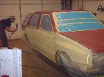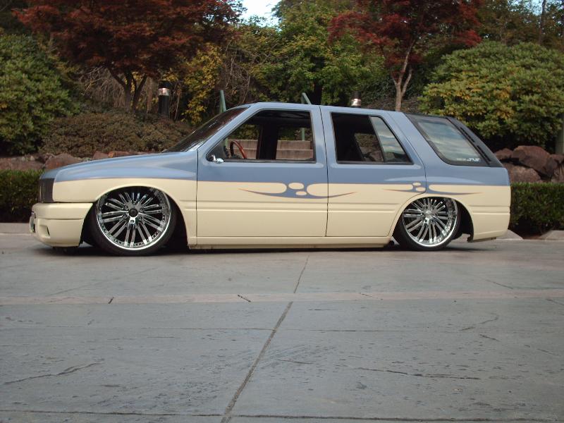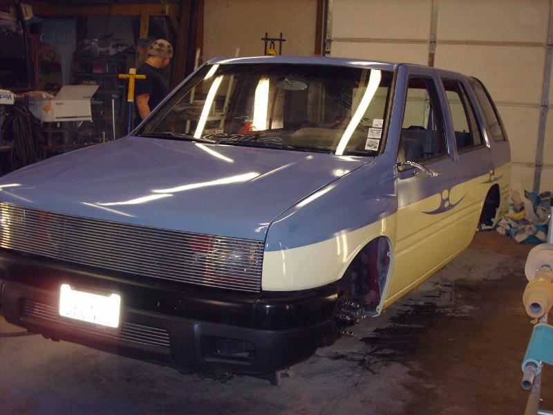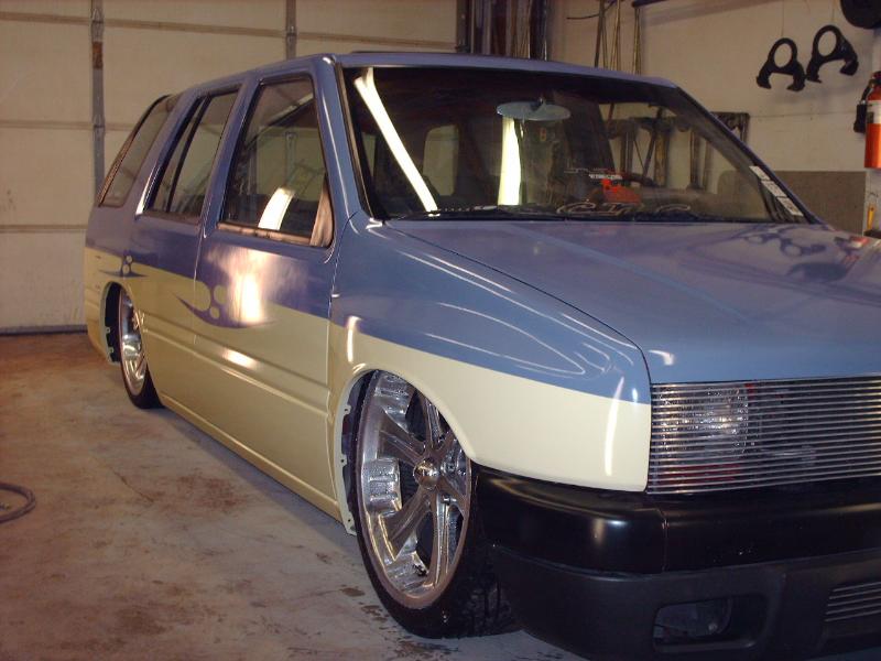 Amigo front end swap. Shaved corners(These fuckers were a night mare. We got 9 Hours into each side just in metal work. As little filler as possible. Thanx Jeff from "JRS Customs", couldnt have done it with out you!), antenna. hood squirters, and emblems. Ford Ranger headlights with a Trenz Toyota Phantom billet (cut down). One off/one pieced front bumper. Shaved the taillights, lower rear rocker corners, spare tire mounting holes, and handles. It has full one-off rear skin combo(thanx Mother Goose Customs) and caddy's with a plate box. Shaved mirrors(replaced with chrome Buell motorcycle mirrors), third brake light, lightbar mounts, and roof rack. 66" x 36" StreetBeat rag. Every thing is primed with custom mixed Sherwin Williams "Passion Purple" and "Mello Yellow" with a cool graphic breaking it up.....Thanks again Jeff at JRS Kustoms.