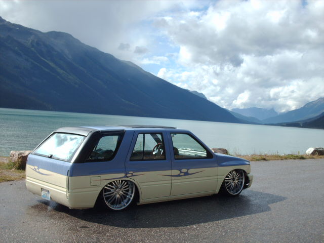 Bodydropped 2 1/4 inches traditional. Thanks to Jay with Fab-Lab and the crew at Advanced Auto Design in Auburn . Bagged front and rear with 2600lb Slam's(thats right, you read correctly, 2600's up front too). This thing gets some crazy mad lift. Its NUTZ! Thanx, Jay from "FAB-LAB". We swapped out a '91 Space cab front clip from the firewall fwd and z'd it up 2 inches while we were at it. The rear was notched and the floor was raised 5.5 inches to cover it all up again. I replaced the rear end with one out of an '87 spacecab which allowed me to get enuff room to get the tires all the way up without rubbing the outer skin. It was all bolted to a solid 2-link that was made by Mothergoose Customs up in Canadia and all welded in by me and Jay. The rear door jams and doors were cut out to give the rims room typical 4-door suv style. Trailer tubs were put in and I am waiting to finish the doors and jams until the bodydrop gets done. A set of 2" drop spindles from Aim finished laying the frame flat on the ground. The entire system is controlled by the Pressurerite system from FAB-LAB. I'll put some new pics up soon.