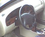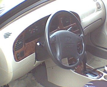 woodgrain dash kit, painted accents, custom KIA seatbelt pads, white gauges, chrome gauge bezel