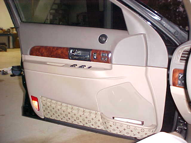 The headliner, back deck, door pockets, sunvisors, headrest, seat inserts, and trunk have all been upolstered in Louis Voutton. Props to Rusty at Penton's Auto Trim.