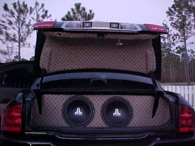 Alpine CVA-1004 head unit, Alpine CHA-S634 disc changer, PS2, Kicker KQ9 9 band EQ, 2 sets of Alpine SPR-136A components, JL AUDIO E4300 to run the mids, JL AUDIO E1800D to run the subs, 2 JL AUDIO 12W3v2's, 2 Luxma 7" headrest monitors, Stinger wiring and a fully sound deadened trunk. The install was done in my shop by me and a friend.