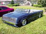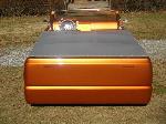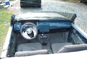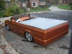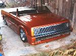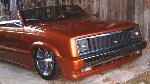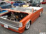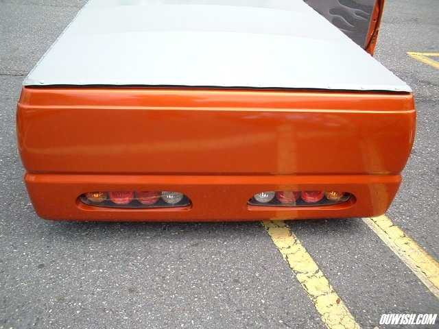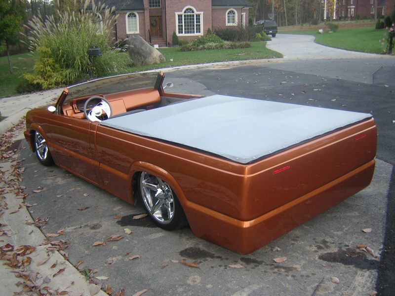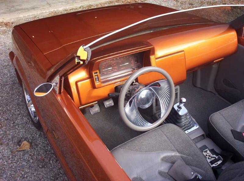 The exterior of the truck consists of shaved everything (door handles, gas door, taillights, corner lights, wiper cowl, emblems, and antennae)phanton billet grille, and the top of the doors and cab are capped off. The top has been removed making it a full time convertible and has a lexan windshield. It has 6 inch HiTech LED taillights and H4 headlights, with Harley-Davidson style side mirrors. The truck was just painted Blazing Copper Pearl (new Mazda color) in Sept. ‘04, Truck was black, grey, green, and blue. It has a 2600i hood and a gray vinyl bed cover that matches the interior.